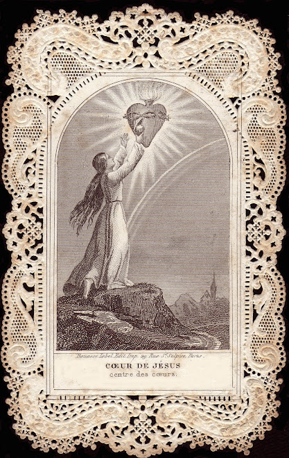 Most of the later holy cards promoted devotion to the Sacred Heart, but the cards that interest me most are the earlier ones that included the Heart of Jesus simply as an element within a composition illustrating some mystery of the love of God made possible through the Incarnation.